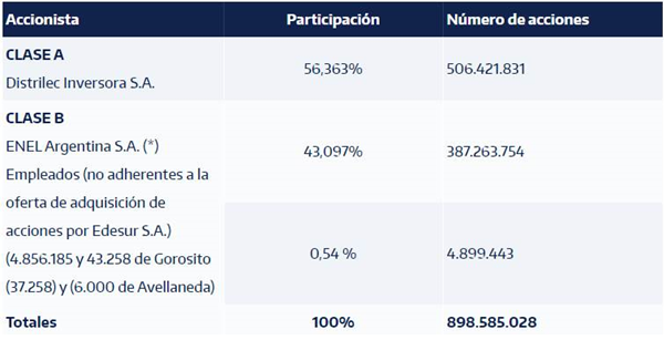 El capital autorizado de Edesur es de $ 898.585.028 representado por 506.421.831 acciones ordinarias escriturales clase “A” y 392.163.197 acciones ordinarias escriturales clase “B”.