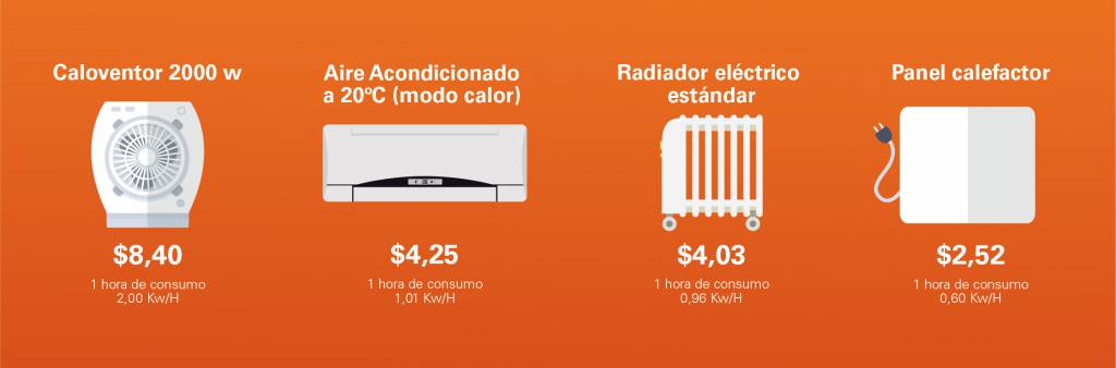 Si vamos al detalle en kilowatts/hora, el panel calefactor consume 0.60, seguido por el radiador eléctrico estándar con 0.96, pasando por el aire acondicionado: 1.1 y finalmente el caloventor con 2.00 Kw/H.