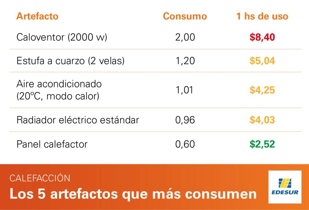 Los caloventores eléctricos son, por lejos, los artefactos de calefacción hogareña que más consumen, cuya potencia en general es de 2000 W. Por otra parte, los paneles calefactores de alta eficiencia pueden llegar a 600 W y alcanzan para mantener una habitación con temperatura agradable.