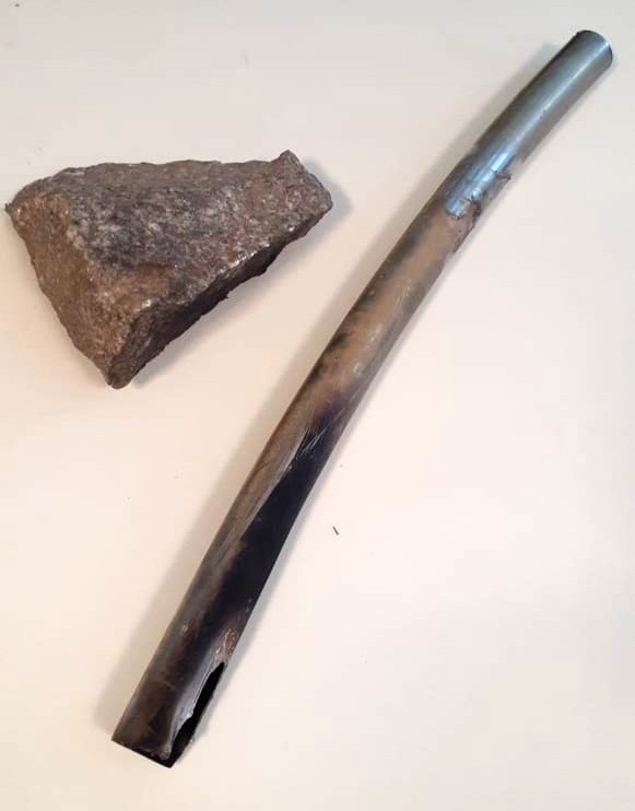 Caño afilado y piedra con la que se intentó el hurto del cable, encontrado en el lugar de los hechos.
