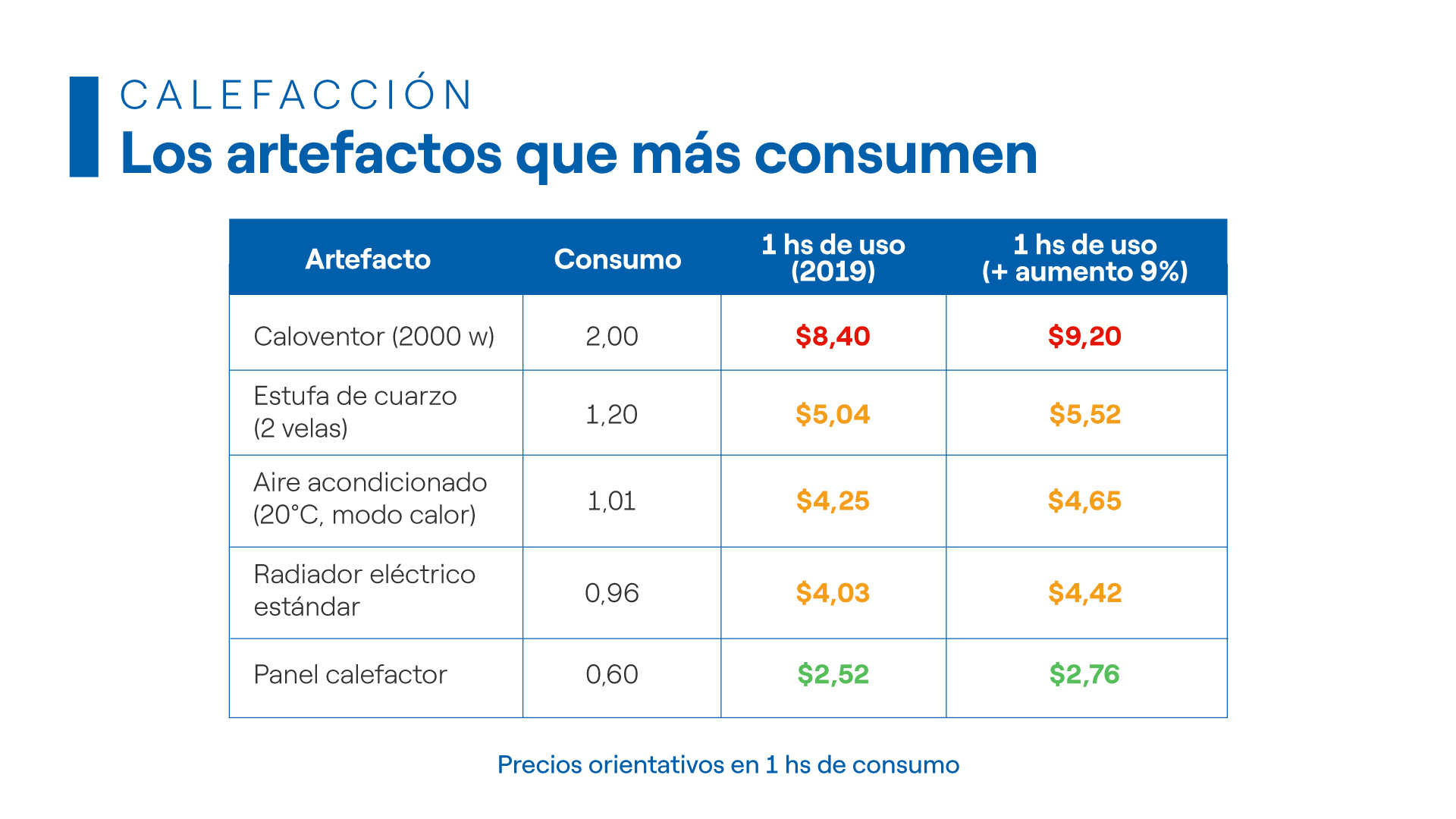 Consumen 0,60 kw por hora, lo que genera un costo de $ 2,76 por hora de uso. Este precio es calculado en base a las tarifas vigentes al 1 de mayo de 2021, con el aumento del 9%. Hasta entonces, el valor era de $ 2,52, es decir un aumento de 24 centavos.