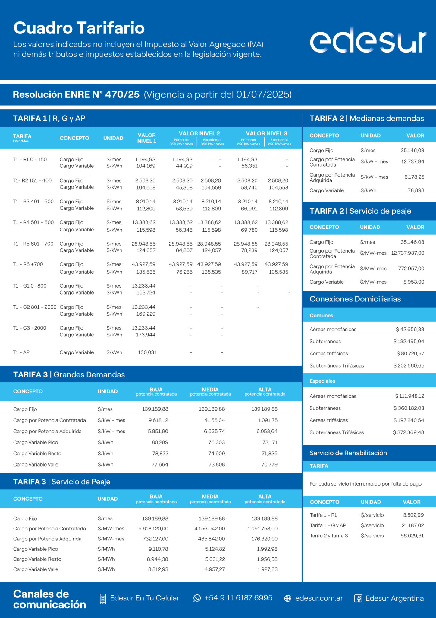 Precios de energía y servicios asociados a la distribución vigentes a partir del 1 de octubre de 2025 respectivamente. Los valores indicados no incluyen IVA ni demás tributos e impuestos establecidos en la legislación vigente.