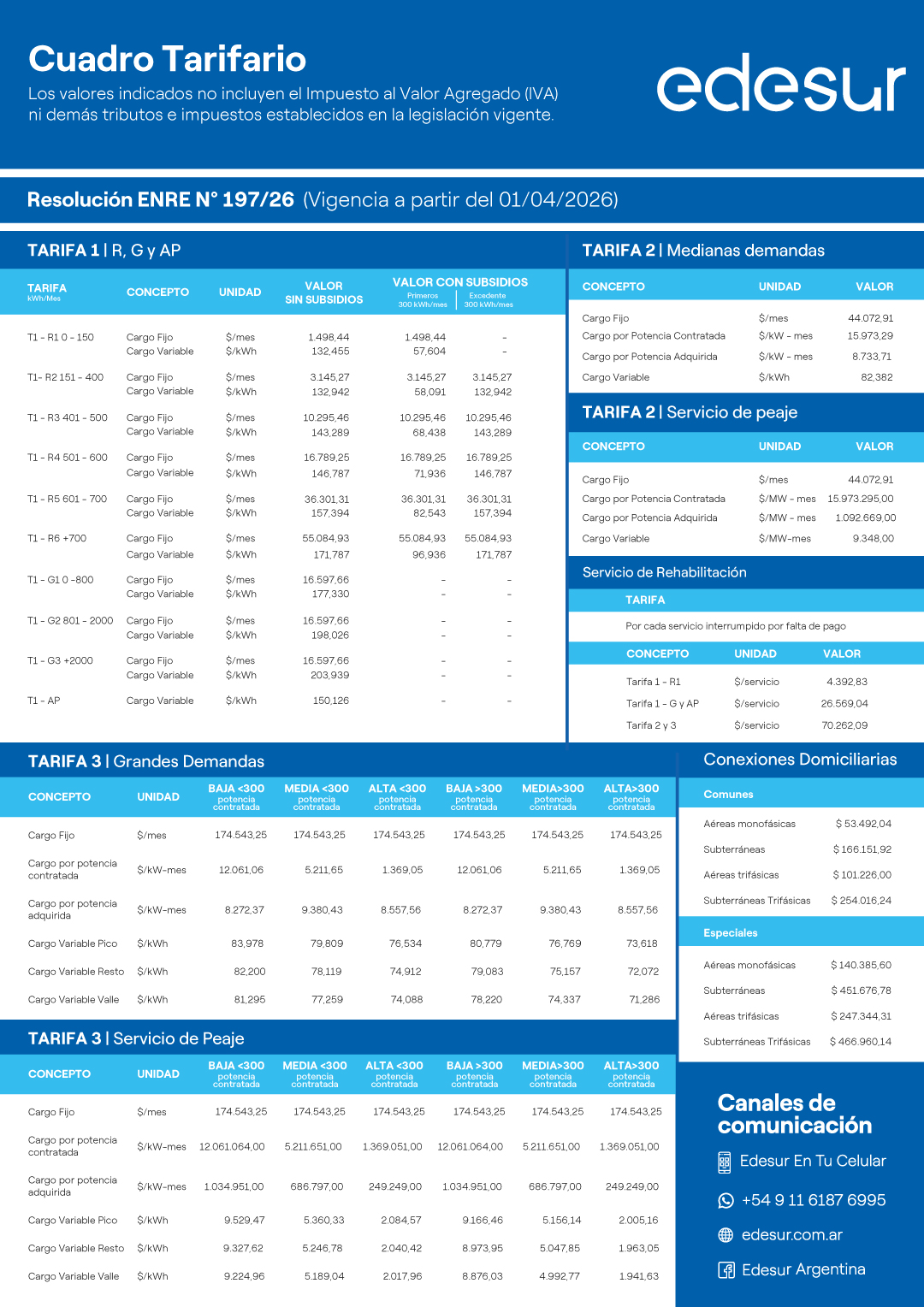 Precios de energía y servicios asociados a la distribución vigentes a partir del 1 de abril de 2026 respectivamente. Los valores indicados no incluyen IVA ni demás tributos e impuestos establecidos en la legislación vigente.